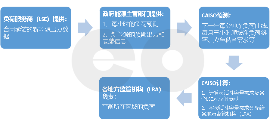 加州能源管理部門與CAISO合作制定電力系統(tǒng)資源充足性規(guī)劃和要求,并為各平衡區(qū)域的所有負(fù)荷服務(wù)商(LSE)制定資源充足性采購義務(wù)。資源充足性規(guī)劃包括發(fā)電容量需求和靈活性容量需求規(guī)劃。靈活性容量需求研究基于:歷史運(yùn)行數(shù)據(jù),負(fù)荷服務(wù)商(LSE)提供合同承諾的新能源出力數(shù)據(jù),加州能源委員會(CEC)提供每小時的負(fù)荷預(yù)測、新能源的預(yù)期出力和安裝信息。CAISO據(jù)此預(yù)測:下一年每分鐘凈負(fù)荷曲線、每月三小時爬坡凈負(fù)荷斜率、應(yīng)急儲備需求等,計算總靈活性容量需求及各負(fù)荷服務(wù)商(LSE)對該需求的相對貢獻(xiàn),并將靈活性容量需求分配給各地方監(jiān)管機(jī)構(gòu)(LRA)。各平衡區(qū)域都要接受資源充足性評估,各地方監(jiān)管機(jī)構(gòu)(LRA)負(fù)責(zé)平衡所在區(qū)域的負(fù)荷。資源充足性規(guī)劃職責(zé)分工和基本流程見圖5所示。
