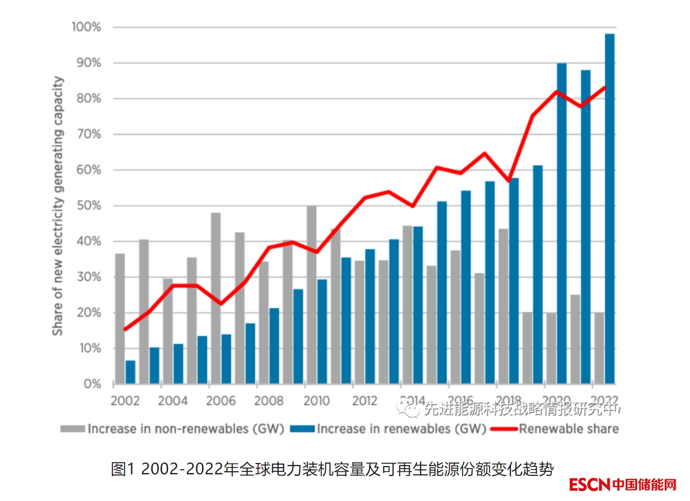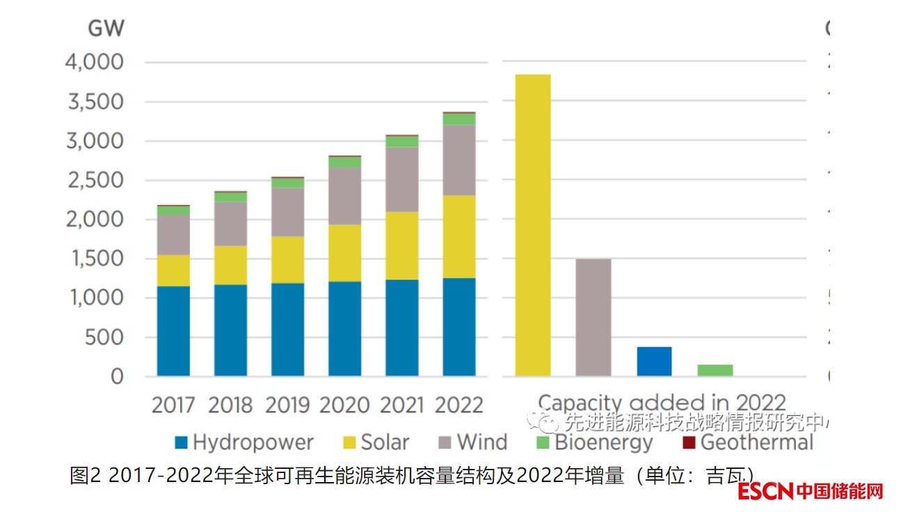 截至2022年底,全球可再生能源發(fā)電裝機(jī)總量達(dá)到3372吉瓦,較上一年增加295吉瓦,增幅達(dá)9.6%。其中,2022年全年新增發(fā)電裝機(jī)容量的83%來(lái)自可再生能源,高于2021年的78%,可再生能源占發(fā)電裝機(jī)總量的比例由2021年的38.3%增長(zhǎng)至40.2%,如圖1所示。