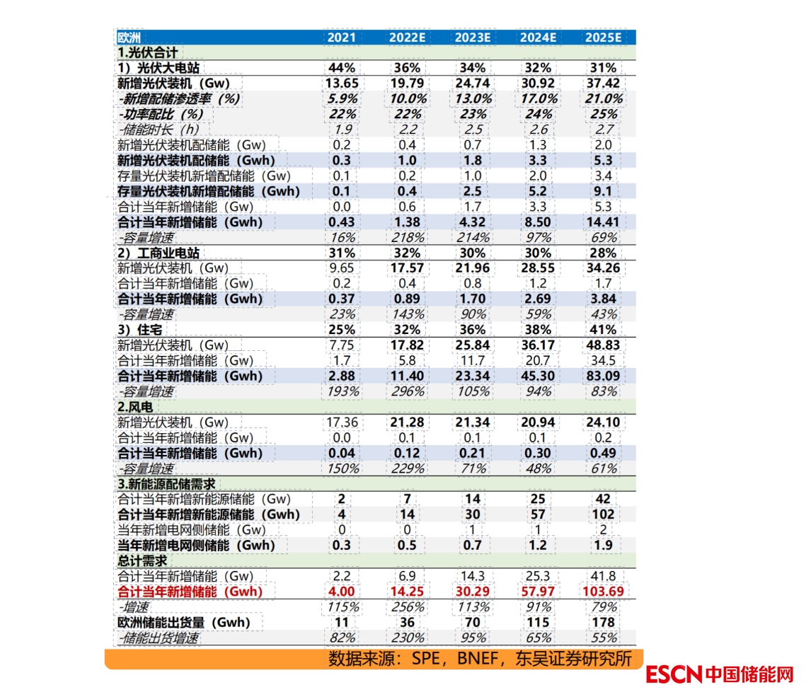 據(jù)東吳證券測算2023/2025年歐洲儲能新增容量需求為30GWh/104GWh,2023年同增113%,2022-2025年CAGR=93.8%。