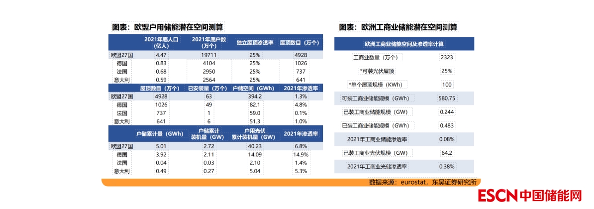 歐洲可開發(fā)光儲屋頂空間廣闊,戶用達(dá)394GWh,工商業(yè)達(dá)581GWh!戶用:根據(jù)歐盟統(tǒng)計局?jǐn)?shù)據(jù),2021年歐盟/德國有1.97/0.41億戶,假設(shè)25%的獨立屋頂(且適宜安裝),則歐盟/德國有4928/1026萬個可安裝光儲的屋頂,假設(shè)每戶平均10kwh,2021年歐盟/德國戶儲滲透率僅1.3%、4.8%,歐盟/德國戶儲仍分別有394.2/82.1GWh的可開發(fā)空間。工商業(yè):2021年歐洲共有2323萬工商業(yè)戶數(shù),假設(shè)25%的可裝光伏屋頂,每戶平均100kwh,歐盟工商業(yè)儲能有580.75GWh的可開發(fā)空間,截至2021年歐盟滲透率僅0.08%。