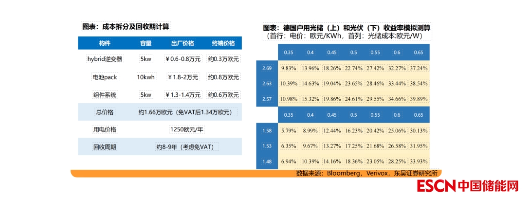 案例:假設(shè)系統(tǒng)由5kW逆變器及10kWh儲能電池構(gòu)成,系統(tǒng)售價為逆變器、電池、組件及安裝費用三者之和共1.66萬歐元,考慮到免除VAT后安裝價格為1.34萬歐元。據(jù)東吳證券測算得出,45歐分電價假設(shè)下德國戶用光儲系統(tǒng)即有18.3%收益率(考慮19%VAT退稅),回收周期為7-8年;若僅安裝光伏,IRR降至12.4%,回收期需13-14年。總體來看,德國戶用光儲經(jīng)濟性十分強勁,我們預(yù)計未來隨著光儲系統(tǒng)成本的下降,戶儲需求將持續(xù)提升!