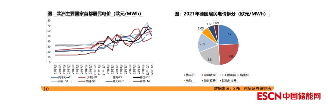 居民電價的上漲原因是售電價格的提高,德國通過減免稅費以減輕居民負(fù)擔(dān)。以德國為例,德國居民電價由售電價格、電網(wǎng)費用、EEG附加費、電稅等費用加總得出。2022年批發(fā)電價的上漲,推動了居民電價合約價格的提高,2022年11月德國居民電價已達(dá)64.19元/MWh。此外,德國已于2022年7月取消EEG附加費,歐洲各國后續(xù)仍有可能逐漸減免或取消相關(guān)稅費,減輕居民端用電負(fù)擔(dān)。