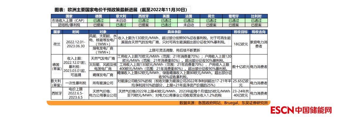 在歐洲邊際定價的模式下,電價大幅拉升,能源公司采購新能源電力的成本遠(yuǎn)低于售電價格,因而獲得超額利潤。在此背景下,歐洲推出兩項措施:1)180歐元市場收入上限(CAP):對可再生能源(太陽能、風(fēng)能、水電等)發(fā)電公司,在2022年12月1日至2023年6月30日期間,市場收入設(shè)置了上限,為180歐元/MWh;2)暴利稅/團(tuán)結(jié)稅:對不可再生能源(石油、天然氣、煤炭等)發(fā)電公司,任何在2022-2023年實現(xiàn)的超額利潤都將至少繳納33%的稅收。根據(jù)歐盟,團(tuán)結(jié)稅的收益應(yīng)流向能源消費者、能源密集型公司等。