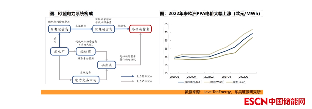 發(fā)電廠的電力一部分通過PPA電價售出。發(fā)電廠通過購電協(xié)議(PPA) 鎖量鎖價的形式與下游能源供應(yīng)商簽署10-20年的電力供應(yīng)合約。2022年因歐洲能源緊缺、批發(fā)電價大幅上漲,PPA電價也呈現(xiàn)出上漲趨勢,2022Q3平均光伏PPA電價為68.6歐元/MWh,同環(huán)增53.1%/14.7%,平均風(fēng)電PPA電價為73.5歐元/MWh,同環(huán)增50.9%/11.1%,能源危機下,電力發(fā)電廠收益顯著提升,加大新能源開發(fā)力度。