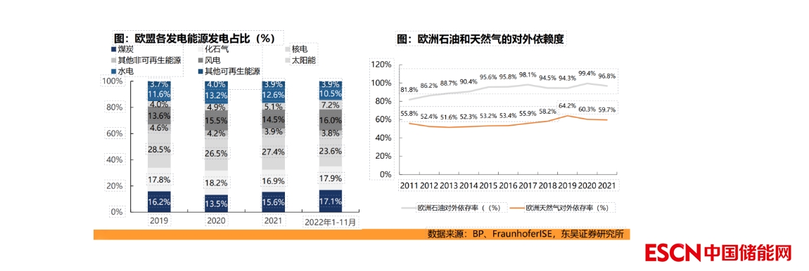 歐洲能源危機的根本原因是能源對外依賴度高,其根本解決方式是實現(xiàn)獨立能源。歐洲高度依賴于傳統(tǒng)化石能源,根據(jù)BP,2021年歐洲石油和天然氣對外依賴度為97%、60%,其中大部分能源來自俄羅斯。因此在俄烏沖突下,外部能源供給減少,直接導(dǎo)致歐洲能源緊缺,長期看只有建立獨立能源才能保證歐洲能源供給穩(wěn)定,光伏風(fēng)電等新能源資源稟賦好、上量速度快,搭配儲能發(fā)展可逐步實現(xiàn)能源獨立。