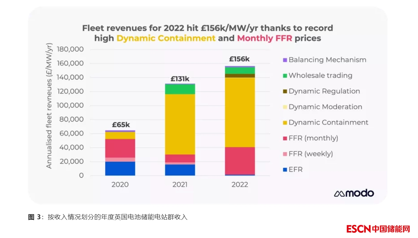 電池儲能電站群的收入相比2021 年增長了 19%,達到 156,000 英鎊/MW。其中的兩大貢獻者是頻率響應的合同收益,特別是Dynamic Containment【2】(占總收入的 63%)和月度 FFR(占總收入的 25%)【2】。