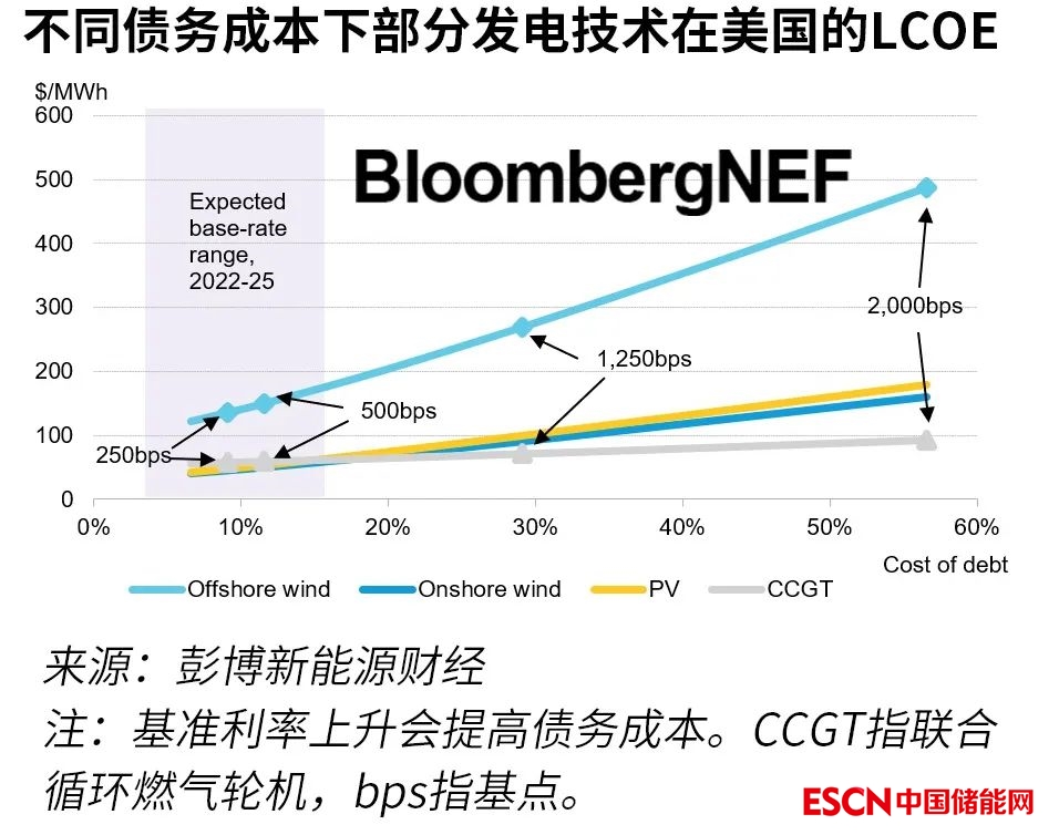 從理論上看,可再生能源相比化石燃料處于劣勢(shì)。在美國(guó),利率每上調(diào)250個(gè)基點(diǎn),海上風(fēng)電項(xiàng)目的平準(zhǔn)化度電成本(LCOE)就會(huì)大漲13.58美元/MWh。這一增幅較天然氣電廠的1.39美元/MWh高約九倍。