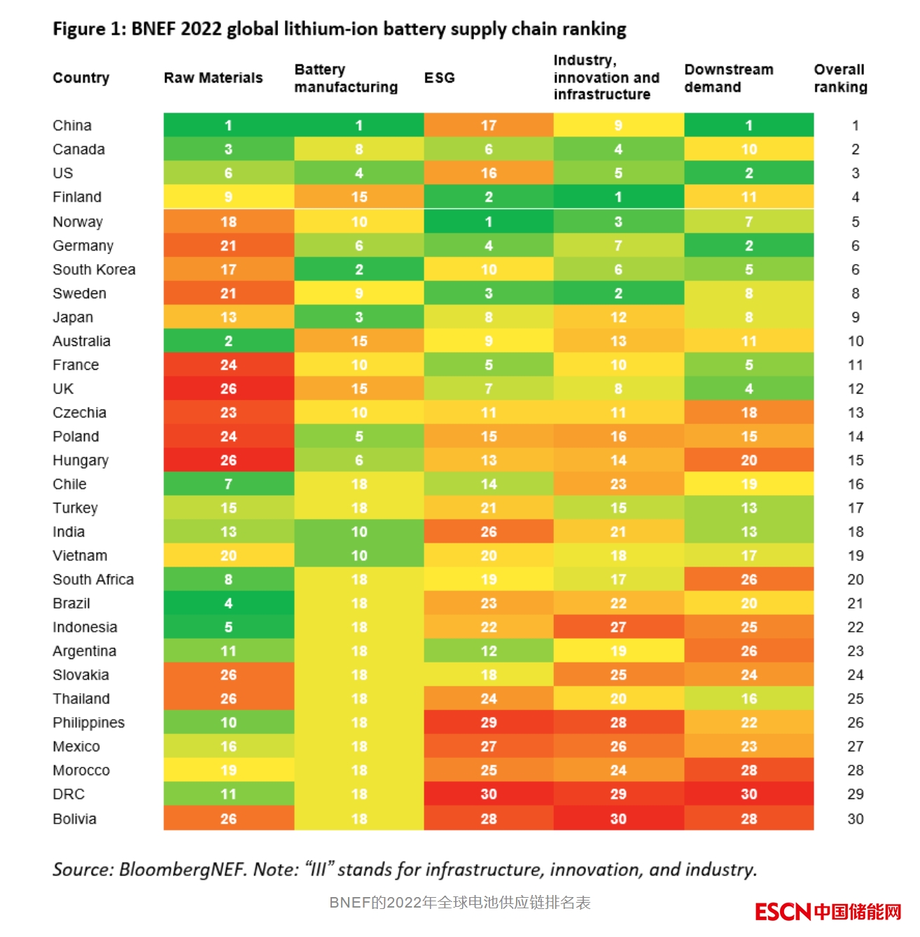 總體而言,BNEF根據(jù)五種標(biāo)準(zhǔn)(原材料、電池制造、ESG、工業(yè)、創(chuàng)新和基礎(chǔ)設(shè)施以及下游需求),對30個參與供應(yīng)鏈的頭部國家進行了評估。