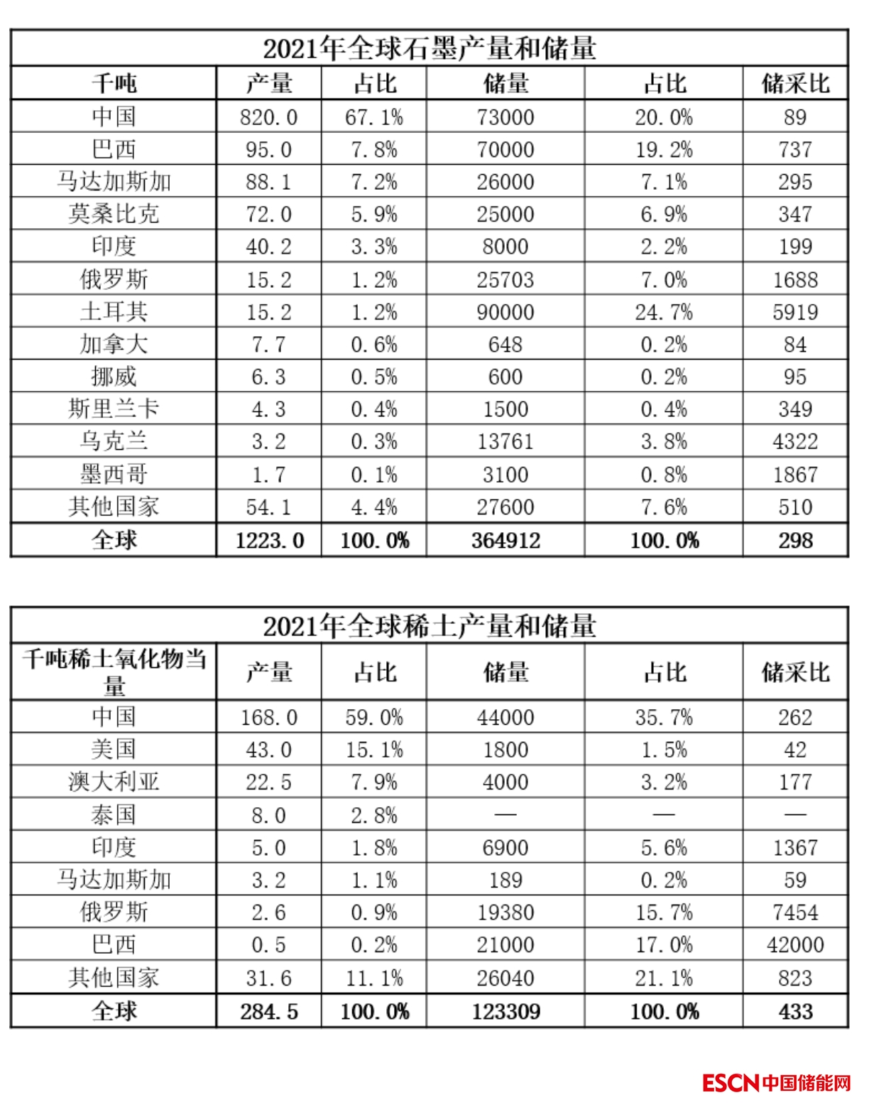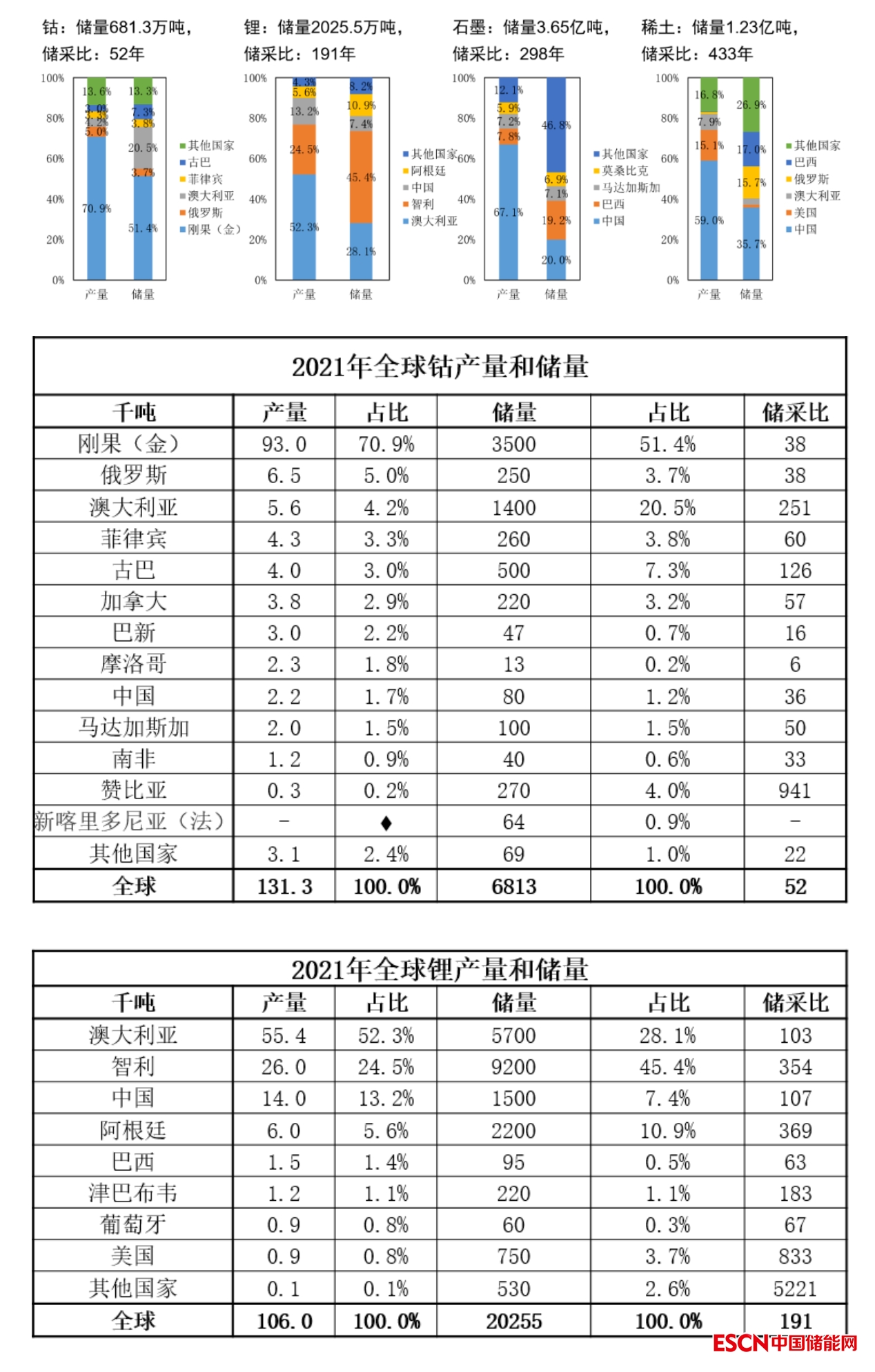 根據(jù)BP世界能源統(tǒng)計(jì)年鑒,2021年,全球鈷探明儲(chǔ)量681.3萬(wàn)噸,產(chǎn)量13.13萬(wàn)噸,儲(chǔ)采比52年;鋰探明儲(chǔ)量2025.5萬(wàn)噸,產(chǎn)量10.6萬(wàn)噸,儲(chǔ)采比191年;石墨儲(chǔ)量3.65億噸,產(chǎn)量122.3萬(wàn)噸,儲(chǔ)采比298年;稀土儲(chǔ)量1.23億噸稀土氧化物當(dāng)量(下同),產(chǎn)量28.45萬(wàn)噸,儲(chǔ)采比433年。