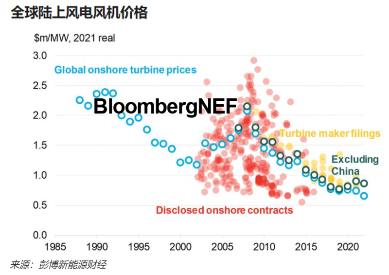 中國(guó)與全球其他風(fēng)電市場(chǎng)的定價(jià)差距不斷擴(kuò)大。在中國(guó),得益于開(kāi)發(fā)商在補(bǔ)貼取消后爭(zhēng)取更低價(jià)協(xié)議、本土供應(yīng)鏈強(qiáng)大且有競(jìng)爭(zhēng)力以及4-5MW更大型風(fēng)機(jī)開(kāi)始普及,風(fēng)機(jī)售價(jià)已經(jīng)跌至新低,與通脹趨勢(shì)背道而馳。