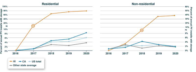住宅太陽能發(fā)電設(shè)施配套部署儲能系統(tǒng)的比例一直在穩(wěn)步增長,但仍占市場的一小部分,占2020年安裝的美國住宅太陽能發(fā)電設(shè)施系統(tǒng)的6%(如圖11所示)。而在非住宅市場,2020年安裝的太陽能發(fā)電設(shè)施系統(tǒng)中只有2%配套部署儲能系統(tǒng),因為這些客戶更有可能獨立部署電池儲能系統(tǒng)。在住宅和非住宅市場中,夏威夷州因其凈計量改革而獨樹一幟,激勵更多的太陽能發(fā)電設(shè)施配套部署儲能系統(tǒng)。加利福尼亞州的住宅客戶可能會通過為防止森林火災(zāi)風險而實施的斷電以及該州政府的激勵措施來增加電池儲能系統(tǒng)的部署。