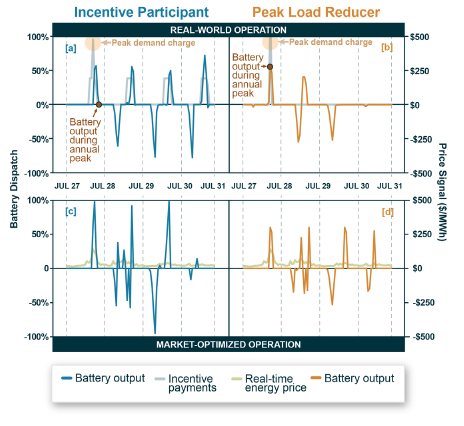 太陽能+儲能項目的行為模型通常假設(shè)項目運營商優(yōu)化電池儲能系統(tǒng)使用以獲得批發(fā)市場收入。但在研究美國各地混合工廠的經(jīng)驗調(diào)度數(shù)據(jù)之后,發(fā)現(xiàn)只有少數(shù)在2020年運營的太陽能+儲能項目主要關(guān)注批發(fā)市場的價格信號。與其相反,特殊儲能激勵計劃(如SMART)的參與者關(guān)注激勵支付的時間(見圖a),負荷服務(wù)實體試圖減少其對容量和輸電需求費用的風險(圖b),以及能源消費者優(yōu)先考慮彈性和公用事業(yè)賬單的最小化。這些替代商業(yè)模式可以為太陽能+儲能項目運營商帶來更高的收入,但不能從電網(wǎng)的角度優(yōu)化儲能調(diào)度,并且有時將會阻礙電網(wǎng)收益。