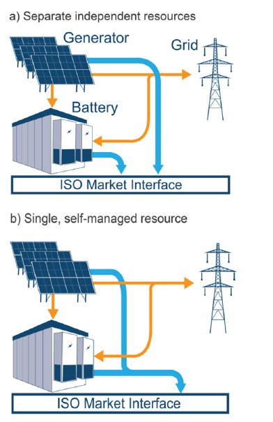 混合部署項目可以作為單一的、完全集成的資源或單獨但位于同一地點的資源與批發(fā)電力市場交互。作為一種綜合資源,混合項目運營商在開發(fā)市場投標時必須預(yù)測風力發(fā)電量或太陽能發(fā)電量,并管理其配套的電池儲能系統(tǒng)。作為單獨的資源進行管理,批發(fā)市場運營商將實施方法來管理電池儲能系統(tǒng)的調(diào)度和風力發(fā)或太陽能發(fā)電的可變性,同時考慮任何耦合約束。