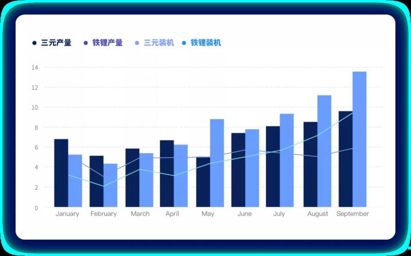 產(chǎn)量方面9月三元電池產(chǎn)量9.63GWh,占總產(chǎn)量 41.56%;磷酸鐵鋰電池產(chǎn)量 13.51GWh,占總產(chǎn)量58.31%,這是連續(xù)第五個月磷酸鐵鋰電池產(chǎn)量超過三元電池。中國正是領(lǐng)先全球做了一次探索性的實驗來確認(rèn)技術(shù)路線的更迭。