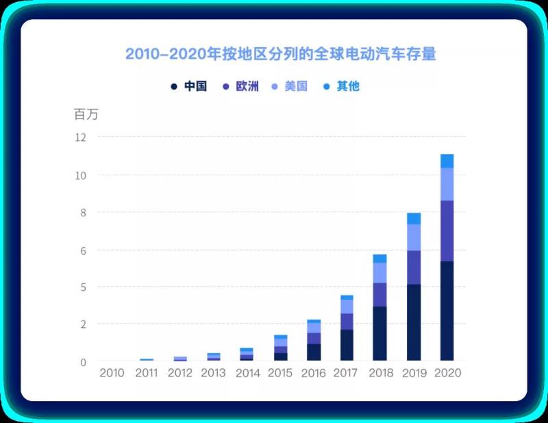 從歷史來看,電動汽車在全球在飛速擴(kuò)展,2020年底,全球一共有1000萬輛電動汽車的存量(中國540萬、歐洲330萬、美國180萬,其他地區(qū)80萬)。但是從2021年開始,每年新增的電動汽車在加速,1-9月中國215.7萬輛、美國42.44萬臺,歐洲157.87萬,這三個市場前三個季度就有416萬臺,按照這個速度2021年一整年550萬臺,全球沖擊600萬臺一年,這個數(shù)據(jù)幾乎是之前電動汽車存量的一半。