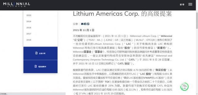 11月2日,Millennial Lithium Corp(千禧鋰業(yè))官網(wǎng)顯示,Lithium Americas Corp(LAC)已經(jīng)向該公司發(fā)出無(wú)條件要約,計(jì)劃要約收購(gòu)該Millennial的所有已發(fā)行股份。