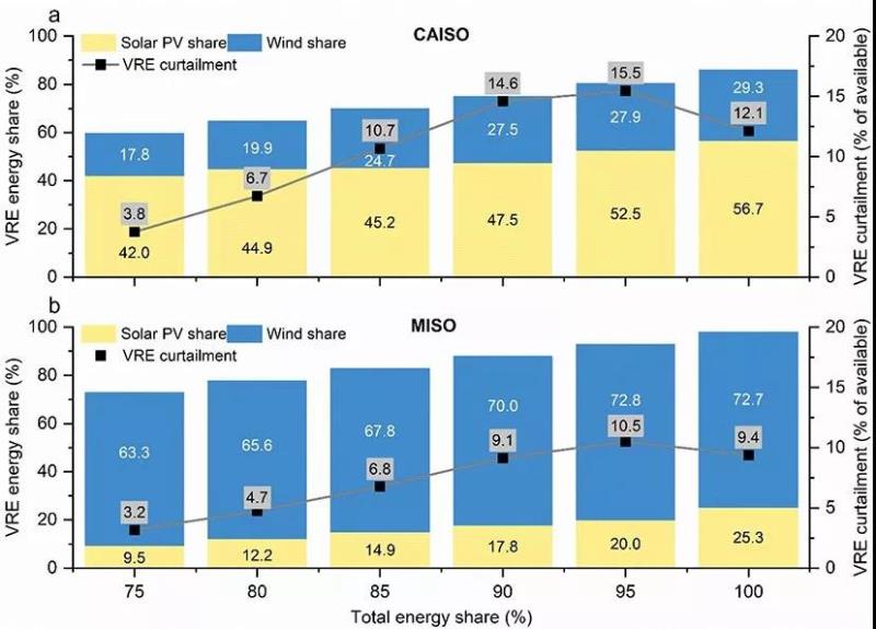 隨著CAISO(上)和MISO(下)系統(tǒng)接近100%可再生能源運(yùn)行,可再生能源的限電開始減少,因?yàn)榧竟?jié)性儲(chǔ)能變得具有成本效益,并增加了系統(tǒng)的儲(chǔ)能容量。