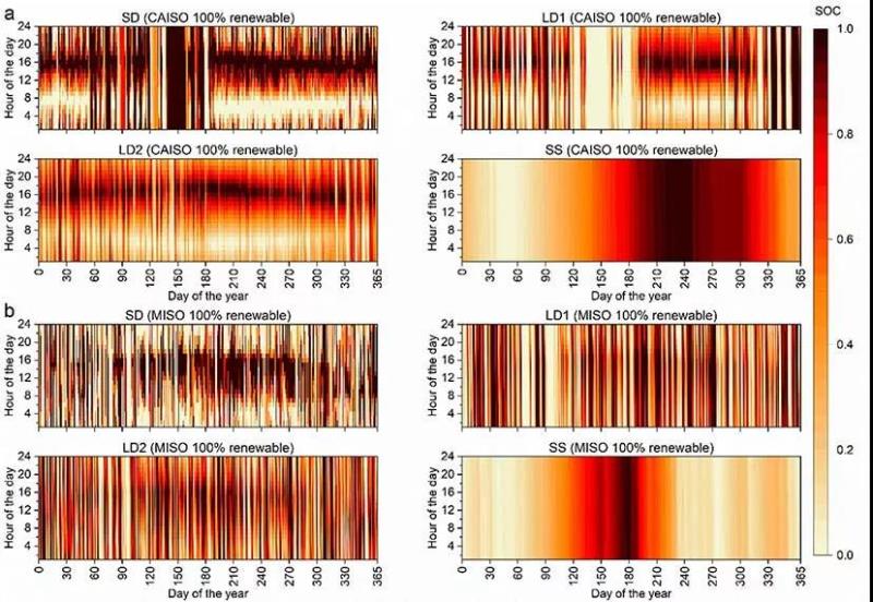 CAISO和MISO中短期(SD)、長期(LD1和LD2)和季節(jié)性儲(chǔ)能(SS)的歸一化荷電狀態(tài)(SOC)。(a)CAISO具有100%可再生能源組合的設(shè)備的歸一化SOC。(b) MISO具有100%可再生能源組合的設(shè)備的歸一化SOC。SOC=1(深紅色)表示儲(chǔ)能設(shè)備已滿。SOC=0(淺紅色)表示儲(chǔ)能設(shè)備為空。