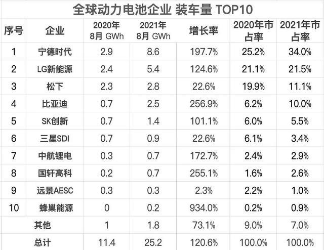 數(shù)據(jù)顯示, 2021年8月,全球動(dòng)力電池裝車量為25.2GWh,同比增長(zhǎng)120.6%,環(huán)比7月增長(zhǎng)11.5%。