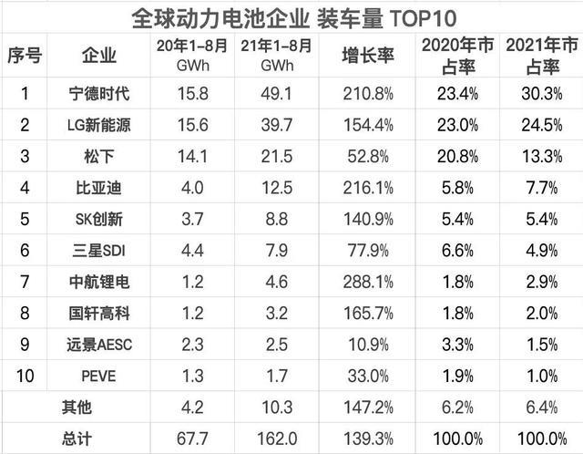 1-8月,中國(guó)企業(yè)的市占率隨本土新能源汽車產(chǎn)業(yè)的快速發(fā)展,進(jìn)一步提升,其中,寧德時(shí)代以30.3%居首,比亞迪以7.7%位居全球第4位。