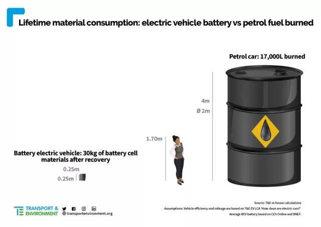 電池網(wǎng)注意到,今年3月份,T&E的運(yùn)輸和電動(dòng)汽車分析師Lucien Mathieu曾表示,燃油車與電動(dòng)汽車在原材料方面,根本沒有可比性。在全生命周期中,一輛普通的化石燃料汽車燃燒相當(dāng)于一疊25層高的油桶。而如果考慮到電池材料的回收利用,電動(dòng)汽車只會(huì)損失大約30公斤的金屬——大約相當(dāng)于一個(gè)足球的大小。