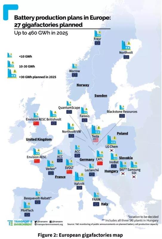 歐盟非政府組織運(yùn)輸與環(huán)境聯(lián)合會(huì)6月份發(fā)布的一份報(bào)告顯示,歐洲現(xiàn)有項(xiàng)目中已建設(shè)或正在建設(shè)的超級(jí)工廠總數(shù)達(dá)到38個(gè),預(yù)計(jì)總年產(chǎn)量為1000GWh,相當(dāng)于生產(chǎn)1670萬輛純電動(dòng)汽車用電池。