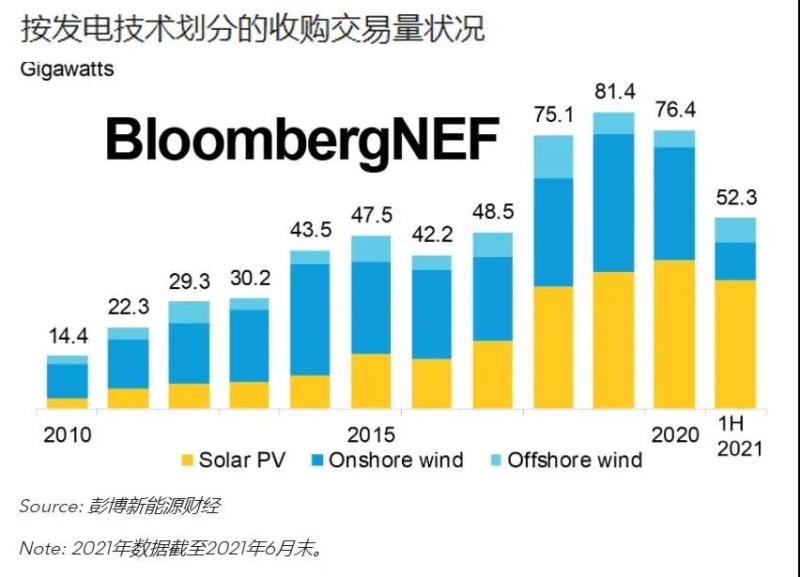 過去三年二級市場上光伏和風電項目交易量保持在較高水平,2020年達到76.4GW。而在2021年上半年投資者成交了52.3GW的項目,到年底成交量有望突破100GW。