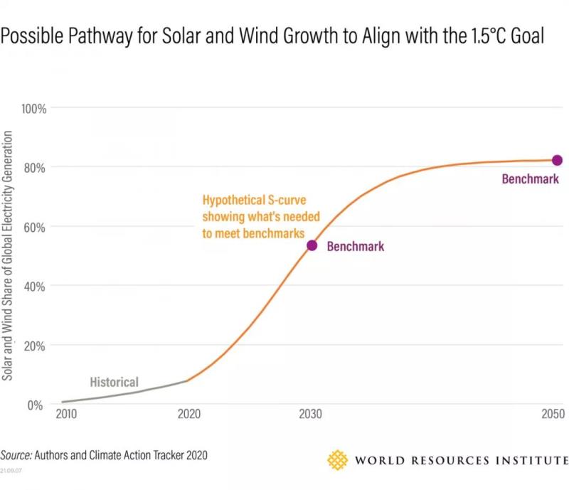 盡管勢頭明顯,但可再生能源的增長速度必須進一步加快,而具體需要加快多少仍存在很大的不確定性。下圖說明了太陽能和風(fēng)能如何達到將全球變暖限制在1.5攝氏度所需的氣候目標(biāo)的一個潛在途徑。