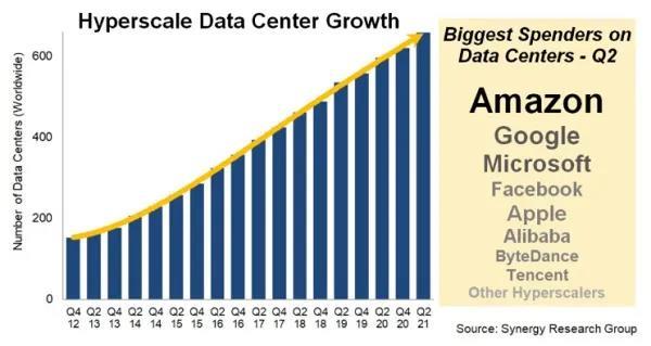 Synergy Research的新數(shù)據(jù)顯示,截至2021年第二季度末,超大規(guī)模提供商(Hyperscale Providers)運(yùn)營的大型數(shù)據(jù)中心總數(shù)增加到659個,相比2016年同期增加一倍多。在所處位置方面,美國和中國繼續(xù)占主要云和互聯(lián)網(wǎng)數(shù)據(jù)中心站點(diǎn)的一半以上。緊隨其后的是日本、德國、英國、澳大利亞、加拿大、愛爾蘭和印度,它們合計占總數(shù)的25%。