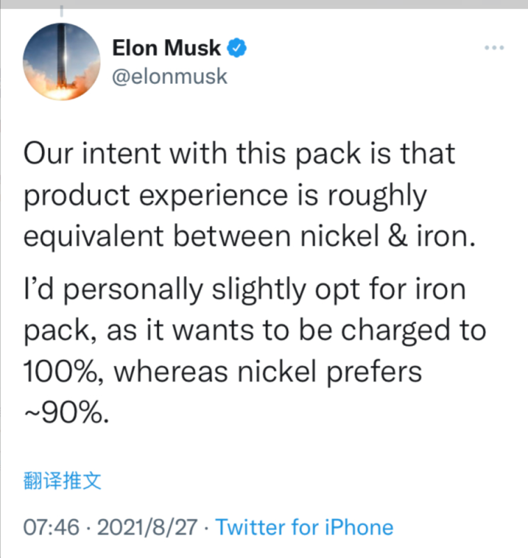 在部分車主咨詢兩個車型差別的 Twitter 下方,馬斯克回應(yīng)稱,自己更喜歡磷酸鐵鋰電池,因為可以充電到 100%,而三元鋰電池只建議到 90%。