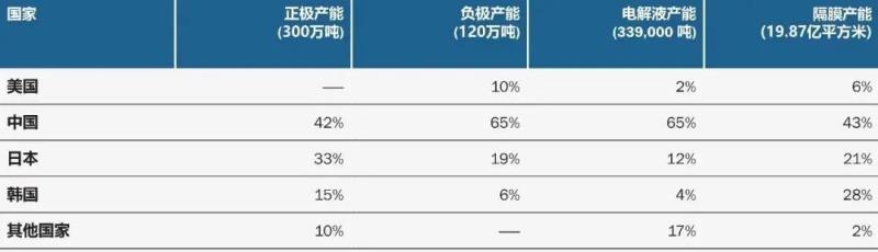 表2:全球主要鋰電生產(chǎn)國(guó)家的主材產(chǎn)能。
