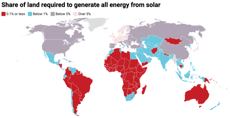 以現(xiàn)有的技術(shù)條件,用太陽能光伏電池板提供全球的能源需求需要45萬平方公里的土地,占全球1.49億平方公里土地面積的0.3%。根據(jù)資源情況,各國、各地區(qū)所需的土地面積占國土面積比例有所不同。