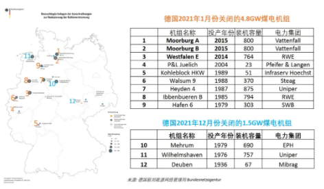 圖1 德國(guó)2021年1月份和12月份分別關(guān)閉的4.8GW和1.5GW煤電機(jī)組名單