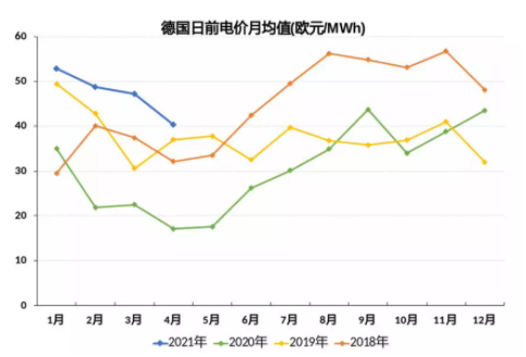 從德國(guó)第一季度市場(chǎng)電價(jià)的走勢(shì)來(lái)看,退煤在一定程度上抬高了電價(jià)。2021年年初,西歐多數(shù)國(guó)家遭遇寒潮,疊加風(fēng)電出力較低,現(xiàn)貨電價(jià)飆升突破100歐元/MWh。雖然這些極高的峰值電價(jià)持續(xù)的時(shí)間最多幾個(gè)小時(shí)或者一天,但是還是造成了第一季度德國(guó)的市場(chǎng)電價(jià)處于高位,平均在50歐元的水平,為四年來(lái)最高。