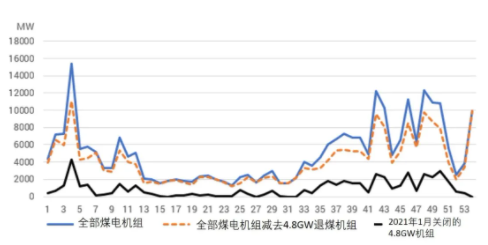 北歐電力分析機(jī)構(gòu)EnergyQuantified估算,年初關(guān)停4.8GW煤電,使得德國(guó)日前電價(jià)峰值上漲約10歐元/MWh。圖4顯示了2020年第1至53周德國(guó)煤電機(jī)組運(yùn)行容量的變化,藍(lán)色線為全部機(jī)組,黑色線則為2021年關(guān)閉的第一批4.8GW煤電機(jī)組??梢钥闯?,在2020年的高峰時(shí)段,這些機(jī)組最高供應(yīng)了4GW的電力,一半時(shí)段有2GW在運(yùn)行,只有第二三季度的運(yùn)行容量較低。也就是說(shuō),2021年初寒潮推高德國(guó)用電負(fù)荷的時(shí)段,這些被關(guān)閉的煤電機(jī)組原本可以提供2-4GW的電力,但是現(xiàn)在只能由成本更高的機(jī)組來(lái)填補(bǔ)缺口,所以使得峰值電價(jià)更高。