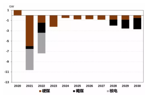 圖5 2020至2030年德國(guó)煤電和核電機(jī)組容量變化(GW)