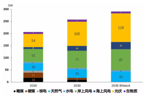 在2021年修訂的可再生能源法案中,德國(guó)制定目標(biāo),2030年光伏裝機(jī)要達(dá)到100GW,海上風(fēng)電和岸上風(fēng)電分別達(dá)到20GW和71GW。德國(guó)聯(lián)邦網(wǎng)絡(luò)管理局在年初發(fā)布的2035電網(wǎng)規(guī)劃草稿中,預(yù)期煤電完全退出,風(fēng)電和光伏裝機(jī)量繼續(xù)增長(zhǎng),同時(shí)也規(guī)劃了一定的儲(chǔ)能和氫能。