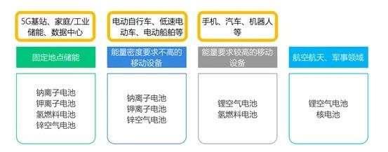 對(duì)于儲(chǔ)能效用好,安全性稍好,成本稍高的電池,可以應(yīng)用在對(duì)便攜性移動(dòng)性要求強(qiáng)的應(yīng)用場景,例如汽車、機(jī)器人等;對(duì)于儲(chǔ)能效用不那么高、安全性好、成本低的電池,可以應(yīng)用在對(duì)空間、便攜性沒有限制的應(yīng)用場景,如5G基站、工業(yè)儲(chǔ)能;對(duì)于儲(chǔ)能效用和安全性極高,但是成本也極高的電池,可以應(yīng)用在航空航天領(lǐng)域。