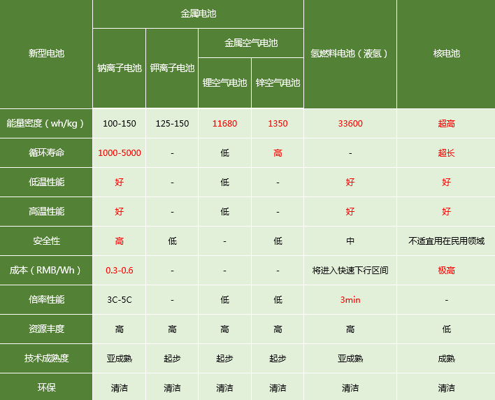 因?yàn)樾滦碗姵卮蠖嗌性谘芯侩A段,所以很多需要實(shí)踐才能驗(yàn)證的數(shù)據(jù)缺失(如成本、安全性等),因此在分析他們的應(yīng)用場景時(shí),主要聚焦他們的優(yōu)勢維度上。
