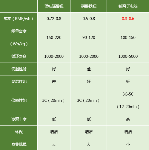 (1)鈉離子電池安全性強(qiáng),高低溫性能好,適用于對(duì)便攜性、移動(dòng)性要求低的場所或者應(yīng)用于對(duì)能量密度要求不高的場景;