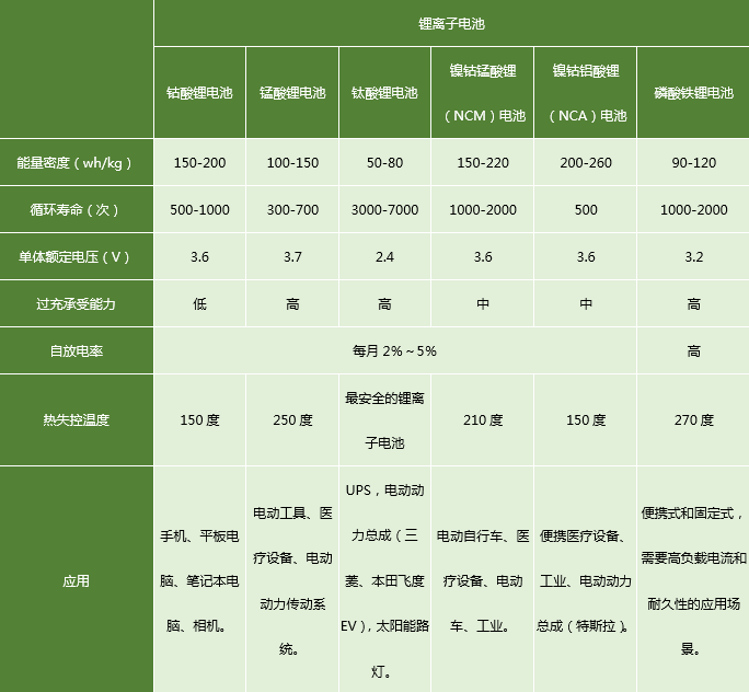 (5)鎳鈷鋁酸鋰電池(NCA):NCA是鋰鎳氧化物的進(jìn)一步發(fā)展,加入鋁賦予電池更好的化學(xué)穩(wěn)定性。高能量密度以及良好的使用壽命使NCA成為EV動(dòng)力系統(tǒng)的候選者。高成本和低安全性卻有負(fù)面的影響。