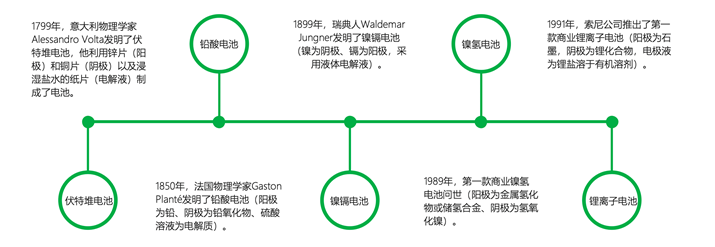 1799年,意大利物理學(xué)家Alessandro Volta發(fā)明了第一款電池(Vlotaic Pile伏特堆),他利用鋅片(陽極)和銅片(陰極)以及浸濕鹽水的紙片(電解液)制成了電池,以證明了電是可以人為制造出來的。