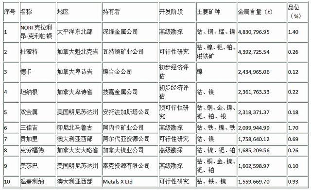 在十大鎳礦項目中,NORI克拉利昂-克利帕頓、三佳吉、克勞福德和美莎巴這4個項目正處于高級勘探階段。加拿大不列顛的2個項目已進入初步經(jīng)濟評估(PEA)階段;其余項目處于預(yù)可行性研究(PFS)或可行性研究(FS)階段。