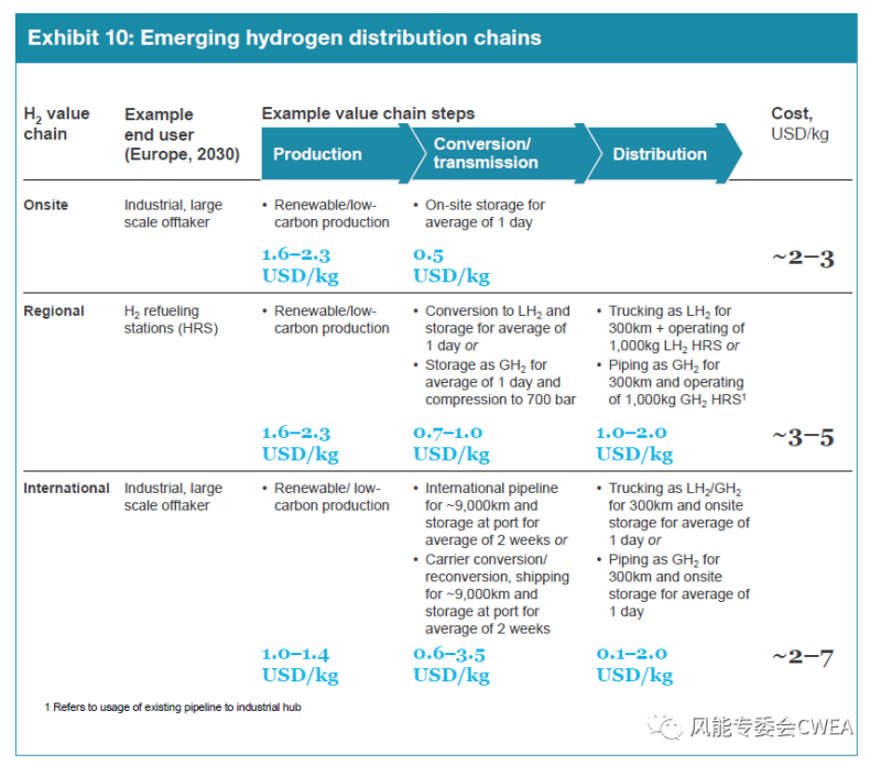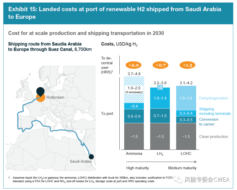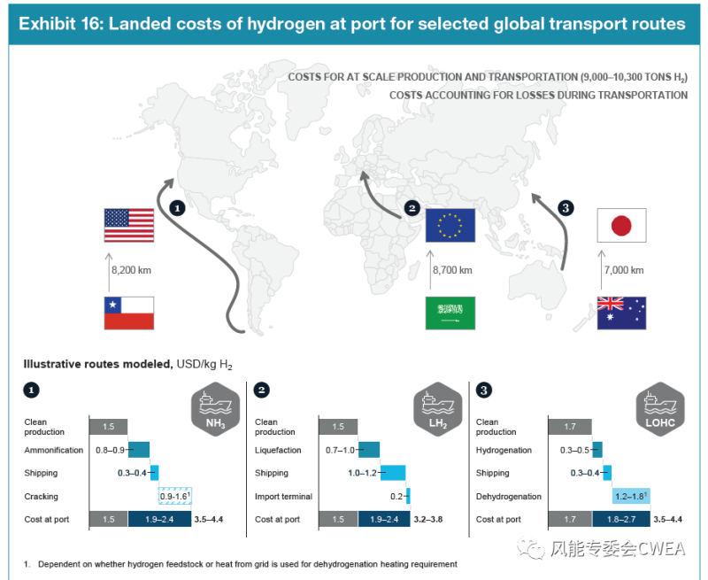 氫能運(yùn)輸鏈分解圖。隨著運(yùn)費(fèi)下降,氫能價格下降很快