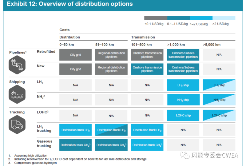 氫能部署方式:管道、船運(yùn)和陸運(yùn)適合的距離和價格。