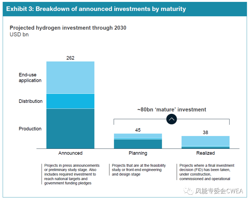 報告稱,如果所有公開的項(xiàng)目最后都能實(shí)現(xiàn),那么到2030年在氫能項(xiàng)目上的總投資將超過3000億美元,其中800億可以視作“成熟”。