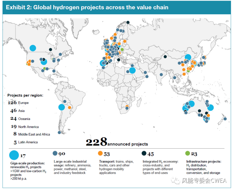 但是,全球低碳?xì)渫顿Y的分布并不均勻,在已宣布的228個大型項(xiàng)目中,有85%都分布在歐洲、亞洲和澳大利亞。