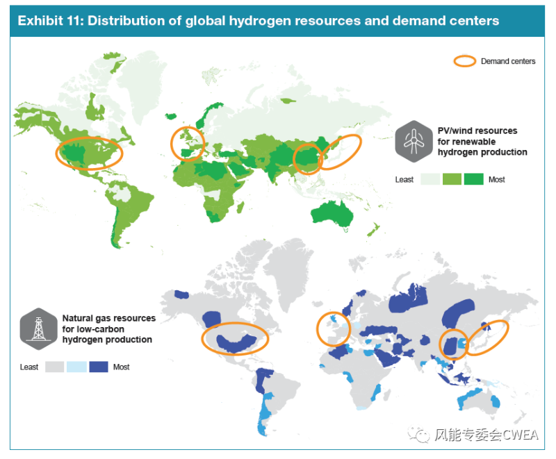 氫能生產(chǎn)中心(分綠氫和藍(lán)氫)和需求中心(黃圈)分布圖