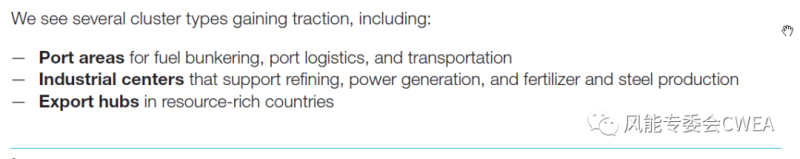 通過具有強(qiáng)大承購方的集群(Cluster)進(jìn)行部署,有助于供應(yīng)商分擔(dān)投資和風(fēng)險,同時建立正向強(qiáng)化循環(huán)。目前有三種集群類型受到關(guān)注:1)為煉油、發(fā)電以及化肥和鋼鐵生產(chǎn)等提供支持的工業(yè)中心;2)資源豐富國家的出口中心;(3)提供燃料加注、港口物流和運(yùn)輸服務(wù)的港口地區(qū)。