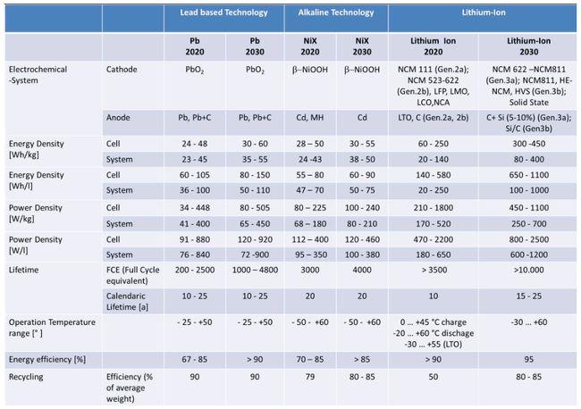 歐洲主流電池技術(shù)包括鉛、鋰和鎳基電池;鈉技術(shù)也有改進(jìn)的潛力,研發(fā)重點(diǎn)是通過(guò)設(shè)計(jì)改進(jìn)提高充電能力和延長(zhǎng)循環(huán)壽命。不過(guò),這類技術(shù)涵蓋范圍較小,不做詳細(xì)評(píng)價(jià)。